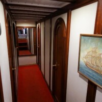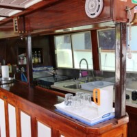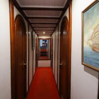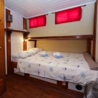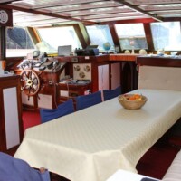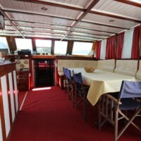 The Odisej has six double cabins are approximately 4x3mtr and one cabin is smaller than the others, approximately 3x3mtr. Each cabin has a double bed, a wide window, storage cabinets and a personal toilet and shower. There is airco available for six hours each day. Below deck there is a salon with a bar and a dining table. On deck you will find another dining table, lounge chairs and 12 sunbeds with towels and pillows.