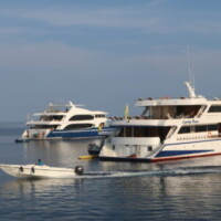 Traditional maldivian boat accompanying the Conte Max, equipped with 2 Coltri MCH13 compressors CATALINA C100(13lt) 227bar alu cylinders DIN/INT fittings and single and twin regulators