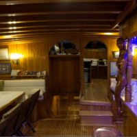 As we move inside, there is a cozy sitting area, with a TV and speakers where you will be able to mingle with the rest of your group, listen to some music, play some board games or read a book from our library. In the same sitting area is our onboard bar, which will be at your dispense, throughout the whole cruise!