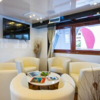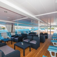 Topdeck, also called the „sun deck“ offers 155 m2 (500 sq ft) of space and is equipped with sun tanning chairs, also WIFI is available free of charge in the salon and in the rear part of the boat.