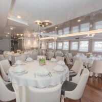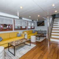 fully air-conditioned main salon with dining area, reception, bar and lounge seating area with LCD TV.