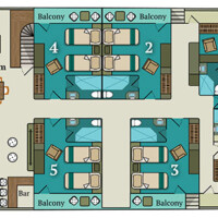 | Accommodation: | Main Deck: Five 215ft² / 20m² double cabins (four with private balcony). Dining room and LoungeUpper Deck: Four 172ft² / 16m² double cabins (all with private balcony). |