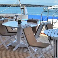 Additionally, on the main deck, the yacht offers ample resting areas, library, TV-DVD room, comfortable dining room and lounge. On the upper deck, the yacht features a charming bar and an excellent area for relaxation, together with a Jacuzzi for six people. On top of the bar area we find the ample sundeck with resting chairs for eight people.