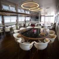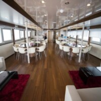 Main salon with dining area, bar and lounge seating, lounge area with LCD TV.