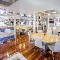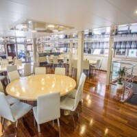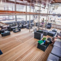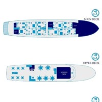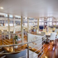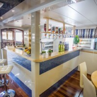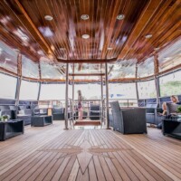 Extra-large “from side to side” fully air-conditioned salon-restaurant of more than 100 m2 is on the upper deck where guests can have their privacy, more than large enough for all passengers, equipped with bar and big screen LCD TV, and each table has easy-access chairs.