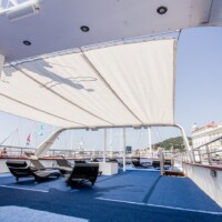 On the high deck is a sun deck that covers 250 m 2 with sun-beds for all passengers. The fence is 110 centimetres high for the safety of passengers. This is the best part of the boat for those who enjoy sunbathing while part of a sun deck is shaded for clients’ comfort.