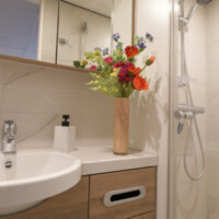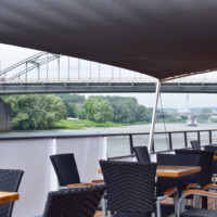 The lower deck has 23 twin cabins (10 m² – 108 sq.ft.). Two twin cabins in the front have two separate beds, set next to each other as a hotel style bed (200 x 160 cm – 78 x 62 inches) and an additional fold away bunk bed as optional third bed (only for children). 20 Twin cabins have two separate beds, set next to each other as a hotel style bed (200 x 160 cm – 78 x 62 inches). All lower deck cabins have a window (80 x 40 cm – 31 x 16 inches) that – for safety reasons – cannot be opened.
