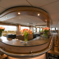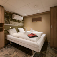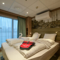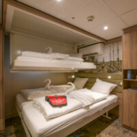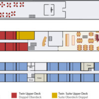 The upper deck offers nine identical twin cabins (10 m² – 108 sq.ft.) and one suite (13 m² – 140 sq.ft.), all with two separate beds set next to each other as a hotel style bed (200 x 160 cm – 78 x 62 inches). All upper deck cabins and the suite have a “French Balcony” (floor-to-ceiling sliding glass doors) instead of a regular window.