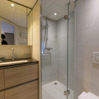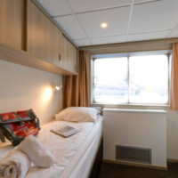 On the upper deck there are also 13 twin cabins (approx. 10 m² / 108 sq.ft) with two separate single beds; 1 double cabin (approx. 10 m² / 108 sq.ft) with a double bed (140×200 cm) and 2 single cabins (approx. 7 – 8 m² / 75.35 – 86.11 sq.ft). The cabins on the upper deck have a panoramic window that can be opened.