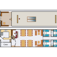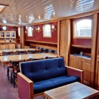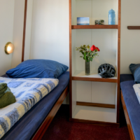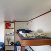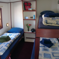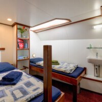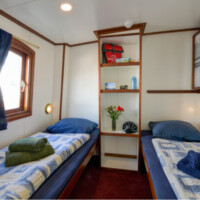 The Elizabeth has ten twin cabins (6 m² – 65 sq.ft.), which all have been fully renovated recently. Eight cabins are situated on the lower deck, two on the upper deck. All cabins have two single beds. Some of the cabins can be booked as a three-bed or four-bed cabin (the third and fourth beds as bunks). Each cabin has an en-suite bathroom with shower, toilet and basin. All cabins have central heating and a window that can be opened.
