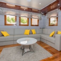 Main salon with dining area, bar and lounge seating, additional lounge area with LCD TV.