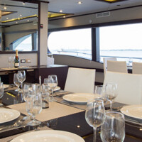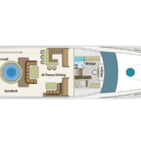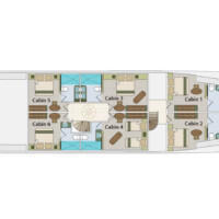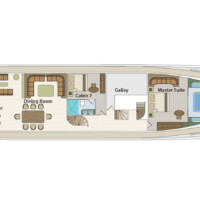 | Accommodation: | Lower Deck: 6 Staterooms – Cabins 1 & 2: 164 ft² / 15.25 m² – Cabin 3: 198 ft² / 18.40 m² – Cabin 4: 176 ft² / 16.30 m² – Cabin 5: 155 ft² / 14.40 m² – Cabin 6: 148 ft² / 13.70 m²Main Deck: 1 Stateroom,1 Master Suite with his and her bathrooms – Cabin 7: 167 ft² / 15.50 m² – Master Suite: 398 ft² / 38 m²Sun Deck: Jacuzzi (Please check with your Guide and Quality Control Manager for our Jaccuzi schedules.) *All cabins with private bathrooms, hot water and air-conditioning. |