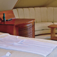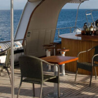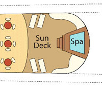 All cabins are on the main deck and are lower twin or king-bedded. There is a large owner’s suite and one single cabin. Each cabin has large picture windows, individual climate control, satellite telephone, a stocked refrigerator, and an entertainment center with CD/DVD, VHS, and LCD monitor. Bathroom facilities are in each suite with a shower, lavatory and toilet. In the second deck salon, you’ll find the bar and lounge seating.