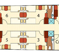 | Cabins | 6 cabins with convertible lower twin/king beds1 Queen-bedded cabin1 singleand 1 Owner’s SuiteAll have picture windowsprivate bath with separate showersindividually controlled air conditioningmini barTV/DVD and CD players |