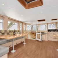 SV Island Solitude is 82′ long and accommodates twelve guests in six cabins. Each is furnished with two lower berths and a private ensuite bathroom, complete with a hot shower. The spacious wheelhouse, located on the main deck, accommodates the entire group during meal time where guests will enjoy healthy and deliciously prepared food surrounded by 360-degree views.