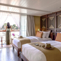 The ship Jayavarman interior design is characterised by a charming French-Colonial theme along with stylish Khmer accents. Public areas are decorated with fine objects d’art emanating an aura of a floating art gallery. The embracing atmosphere invites to feel at home from the first step aboard. An open kitchen adds a unique flair to the culinary life on board experience.