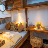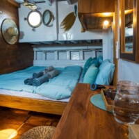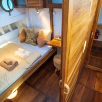 Designed with comfort in mind, Jinggo Janggo’s cabins offer a tranquil haven after exploring Indonesia’s waters. Their simplicity fosters bonding and relaxation for families or friends, without unnecessary distractions. With adaptable spaces, they suit groups of varying sizes, offering two double cabins, one cleverly including an extra single bed. Whether a group of four adults and one child or five adults, enjoy a delightful stay in cozy comfort aboard the Jinggo Janggo.