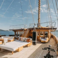 The yacht was designed in 2012 by esteemed yacht designer Marcelo Penna of Barcelona who, while retaining the elegance of the traditional vessels on which Lamima’s lines are based, has unobtrusively incorporated refinements to enhance her intrinsic strength and stability. She offers a massive 400 sqm of the open deck on a total of 900 sqm of usable space. Marcelo has also given her an impressive sail wardrobe designed to catch every breeze of the archipelago, thus creating a first-class sailing vessel with all the opulence of a super-yacht.
