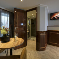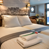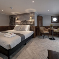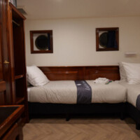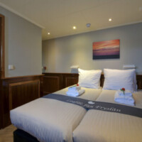 On the lower deck, the Leafde fan Fryslân has sixteen well-appointed cabins. Twelve twin cabins (10 m² – 107 sq.ft.) and one smaller twin cabin (9 m² – 96.8 sq.ft.), with two single beds, which can be set together in most cabins, one junior suite (12 m² – 129 sq.ft.) with two single beds, which can be set together and a small sitting area and two single cabins (7 m² – 75 sq.ft.). Two of the twin cabins can be booked as a three-bed cabin (the third bed as bunk).