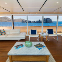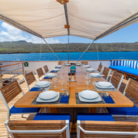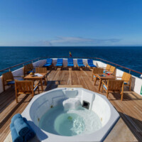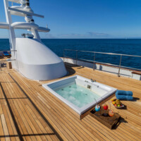 Passion with her 2 VIP suites and 5 staterooms can host 14 passengers. While not exploring the many visitor sites with your Galapagos National Park trained naturalist guide, you can relax in the large salon with high-speed internet. Plus, the deck space is second to none, there is the sky lounge to enjoy a sundowner, the top deck with a hot tub, the back deck to enjoy a dinner under the stars, and the forward deck to sightsee the dolphins surfing the bow.