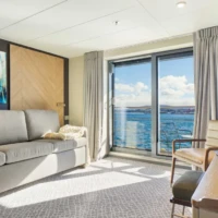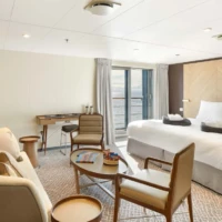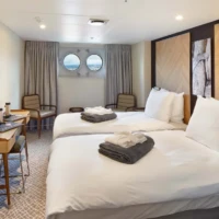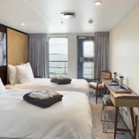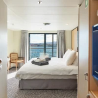 For our air-cruises, Magellan Explorer has a capacity for 76 guests accommodated in seven categories of accommodation, including dedicated single cabins. All cabins except Porthole cabins feature private balconies. All double cabins except two have two twin beds that can be configured as one king-size bed. All cabins feature a wardrobe, individually controlled heating system, a sitting area, and a private bathroom with a shower and heated floors.