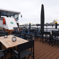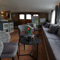 The upper deck has a tastefully furnished salon with a restaurant area, a nice bar and a lounge area with sitting corners, air-conditioning, TV and large panoramic windows. Wi-Fi is available. Large glass doors open to the beautiful partially roofed teak wood sundeck with chairs and tables between the salon and the wheelhouse. Bicycles are stored on the front deck.