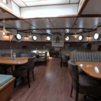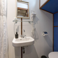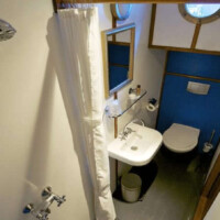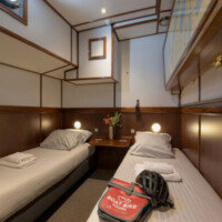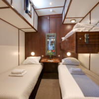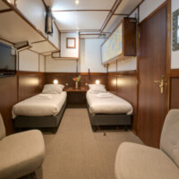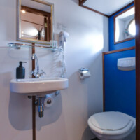 On the lower deck there are fourteen comfortable cabins. Twelve twin cabins (9 m² – 97 sq.ft. ) with two single beds which can be set together, one junior suite (11 m² – 118 sq.ft.) with two single beds which can be set together and a small sitting area and one single cabin (6 m² – 65 sq.ft.). In all the two-bed cabins a Pullman bed/fold-down bed can be arranged. Each cabin has an en-suite bathroom with shower, toilet and basin. All cabins have ventilation, central heating and portholes that can be opened. Furthermore, each cabin has a mini safe and a hairdryer.