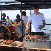 On the lower deck, the Mare fan Fryslân offers a cozy lounge/restaurant area with wooden paneling and air conditioning and a nice and warm atmosphere. From here you can reach the wheelhouse on the upper deck, fitted with a large seating area, a well-equipped bar, music & video equipment and TV. The large, panoramic windows offer a breathtaking view over the water. Wi-Fi is available. The wooden upper deck offers adequate seating, the steering unit, space for the bicycles, an outdoors bar with a draught beer tap and a grill, and even a Jacuzzi. When the weather is nice you can relax here or enjoy the scenery while sailing.