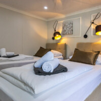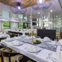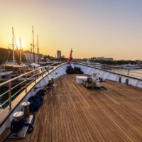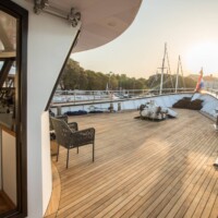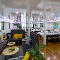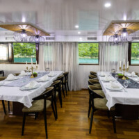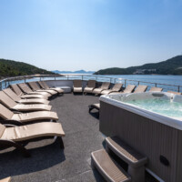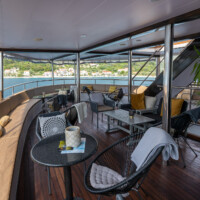 The ship boasts various communal areas, such as an indoor restaurant and bar, seamlessly connected to a spacious outdoor lounge. On the top deck, guests can relax on sun loungers and find sheltered areas to enjoy the panoramic views.