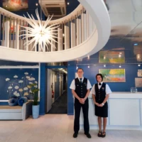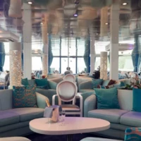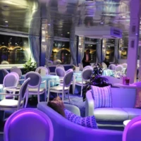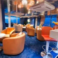 Every shade of blue, from night blue on the walls to the soft blue on the leather sofas, dress every space of the ship. The colour orange brings a touch of pep to the lounge / bar.