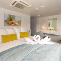 Completely renovated in 2017 according to the company’s new standards, this ship now offers much more spacious cabins with large bay windows on the upper deck. The soft and feminine decoration mixes shades of pink with aubergine and anise colors in the common areas. The cabins evoke a marine atmosphere.