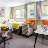Partially renovated in 2016, the ship takes on a sparkling and vintage look with its anise and chocolate colors. The houndstooth-type patterns recall the elegant outfits of ladies from the sixties. The cabins display retro photographs representing Parisian monuments.