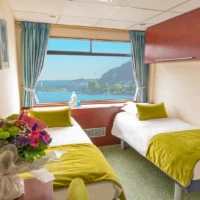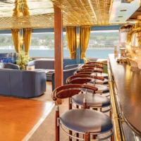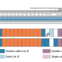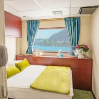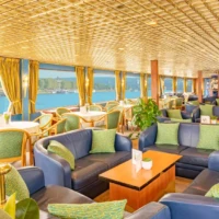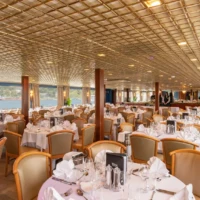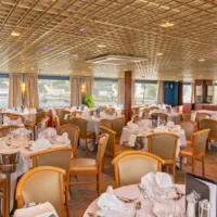 Located on the upper deck, the restaurant, where all meals are served during the cruise, offers a delicate cuisine in a refined setting, where large windows allow to fully enjoy the panorama. Also situated on the upper deck is the lounge/bar with a dance floor. Comfortable sun loungers are provided on the sun deck with a large shaded area, the ideal place to relax and admire the surrounding landscapes.