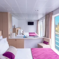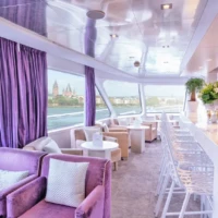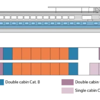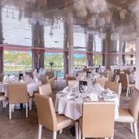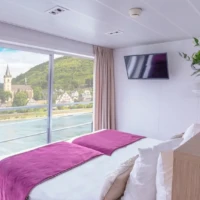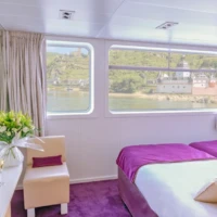 Completely renovated in 2014, the MS Lafayette is an intimatesized Premium ship, 90m long and 10m wide. It can accommodate 82 passengers, in 43 double or single cabins, spread over two decks. The size of each cabin is between 10 m2 to 15 m2, has all amenities and provides guests with all the comforts they need during their stay. The contemporary interior is decorated in gray and sand tones, combined with mauve and lilac shades. Located on the upper deck, the restaurant, where all meals are served during the cruise, offers delicate cuisine in a refined setting, where large windows allow guests to fully enjoy the panorama. On this same deck is also the lounge / bar with a dance floor and central bar. The sun deck is the ideal place to relax and admire the landscapes, offering comfortable sun loungers, as well as a large shaded area.