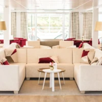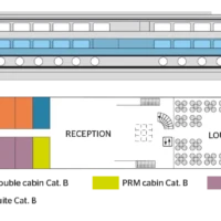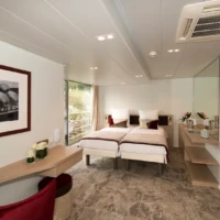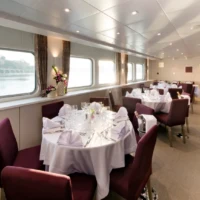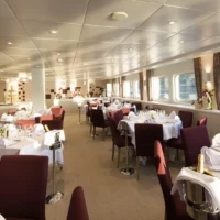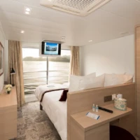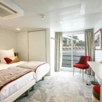 Large windows allow you to enjoy the landscapes from the restaurant or from your cabin. The restaurant is located at the front of the main deck and the lounge / bar at the front of the middle deck. The cabins are spread over 3 decks: cabins with French balconies are on the middle and upper decks. A swimming pool and sun loungers provide a maximum comfort on the sun deck.