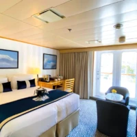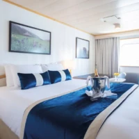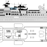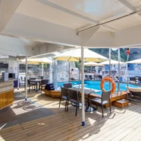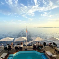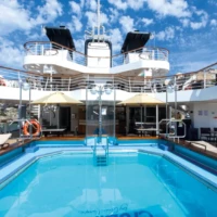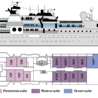 The MV La Belle des Océans, an elegant and perfectly sized Premium ship measuring 103 meters long by 15 meters wide, has 7 decks. It can accommodate 130 passengers in 65 spacious cabins and suites, all with exterior views. On board, every step is an adventure. From the lounge / bar to the swimming pool and the fitness center, from the spa to the wellness lounge, between well-thought-out spaces and tailormade services, everything has been designed to offer high-end
