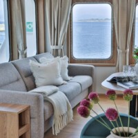 MV Vikingfjord offers cruise ship comfort on a small ship with 8 ensuite cabins, an open plan lounge with rear facing windows, an observation lounge in the bridge, an on deck hot tub and sauna, and a light and modern Scandinavian design.