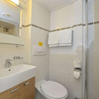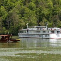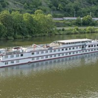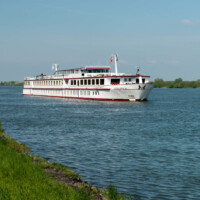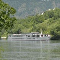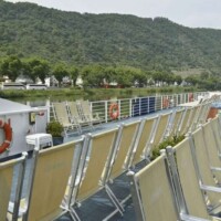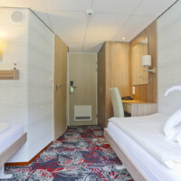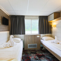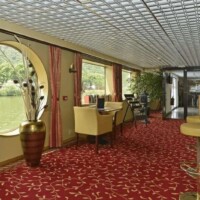 The Normandie’s capacity is a total of 51 cabins, 49 twin-cabins, and two single-cabins. The twin-cabins on lower and upper deck are approx. 10-11 square meters in size and are equipped with two single beds, a shower and WC, hairdryer, TV, safe, central air-conditioning and a picture window. Only windows on the upper deck can be opened. The single-cabins are a bit less spacious (7 qm) with only one bed but otherwise have the same features.