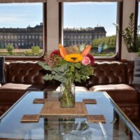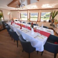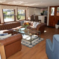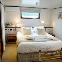 Panache is a hotel barge that has been fitted out in traditional yacht style with brass and mahogany fittings in the spacious public areas and very comfortable cabin accommodation. In the saloon, the picture windows let in plenty of natural light, and the tempting cocktail bar and comfortable leather sofas are enhanced by polished hardwood flooring. The separate roomy dining area provides a congenial setting for up to 12 guests to enjoy the gourmet meals and fine wines served on board.