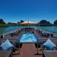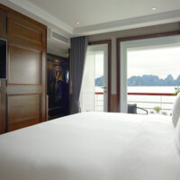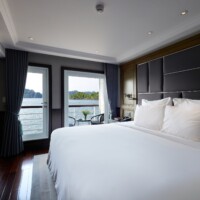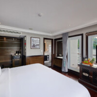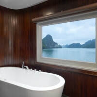 Located on the upper deck of the ship with unobstructed views of poetic Lan Ha Bay. The sumptuous cabin features a comfortable seating area as well as a walk-in closet and an ensuite marble bathroom.