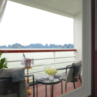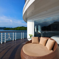 Grand Balcony cabins are located on the main deck, with the option for two single beds or a double bed. Broad windows offer picture-perfect views of Lan Ha Bay from anywhere in the cabin. All cabins have balconies, including the entry-level Grand Balcony cabins, with comfortable chairs in which to sit back with a book and absorb the views. The large en-suite bathrooms feature a spacious standing shower, with luxury shampoos, soaps, and other self-care products.