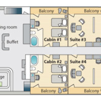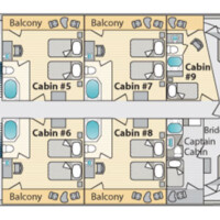 | Accommodation: | Main Deck: 2 Suites 441ft² / 41m² (private balcony)2 Double Staterooms 301 ft² / 28 m² (private balcony)Upper Deck: 4 Connected Cabins 301 ft² / 28 m² (private balcony)Sun Deck: Jacuzzi (Please check with your Guide and Quality Control Manager for our Jaccuzi schedules.) |