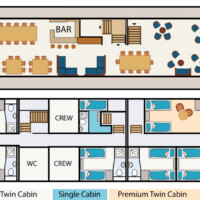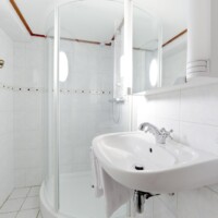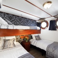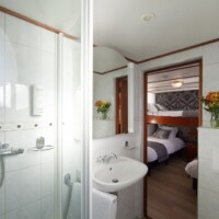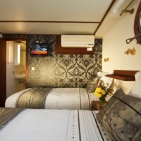 The Princesse Royal has sixteen cabins, situated on the lower deck. Guests are accommodated in eleven twin cabins (11 m² – 118.5 sq.ft.) with two single beds set next to each other, four premium twin cabins (14 m² – 151 sq.ft.) with two single beds next to each other and a small sitting area and one single cabin (7 m² – 75.5 sq.ft.). On prior request, the beds in most twin cabins can be set together as a double bed. On request, an additional bed is available in some twin cabins for children up to age 16 (as fold away bunk bed, above one of the other beds). Each cabin has an en-suite bathroom with shower, toilet and wash basin. All cabins have an individually regulated air conditioning, ventilation system and central heating; the portholes in all cabins are fixed for safety reasons. Furthermore, each cabin has a flat screen (satellite) TV, a mini safe and a hair dryer.