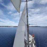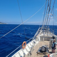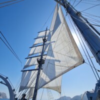 Our ship’s rigging – barquentine– has four-sided sails on the foremast and gaff-sails on the main mast and on the mizzen.