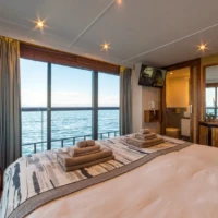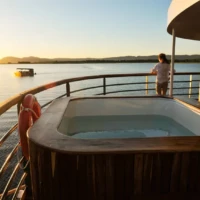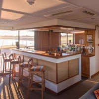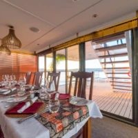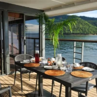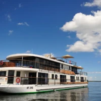 Combining elegance and exoticism, comfort and refinement, the RV African Dream is a luxury cruise ship, which sails on Lake Kariba. The ship measures 33 m long and 8 m wide, and can accommodate 16 passengers, in 8 cabins with a size of 17 m2. Of all cabins, 6 are with a French balcony and 2 with a small private terrace, offering amenities and providing guests with all the comforts they need during their stay. The spacious areas and large windows give the ship a bright appearance. The interior is decorated with noble wood and local fabrics and blends in perfectly with the spendid surrounding landscapes. Situated on the upper deck are a small pool, the restaurant and lounge / bar where binoculars are available for wildlife and flora watching. The sun deck remains the ideal place to relax and admire Southern Africa’s magnificent sites, which are among the most beautiful in the world.