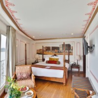 Built in 2014, the RV Ganges Voyager is a magnificent intimate-sized Premium ship that sails on the Ganges, the sacred river of ancient India. It is 56,50 meters long and 12,50 meters wide. It can accommodate 56 passengers, in 28 cabins spread over 3 decks. The size of each cabin (or suite) is between 24 m2 to 37 m2, offers amenities and provides guests with all the comforts they need during their stay. The decoration of the ship is stylish and its atmosphere in perfect harmony with its surroundings. The precious fabrics and fine materials give it a particularly refined dimension. The restaurant, which offers a delicate cuisine in beautiful surroundings, is located on the main deck. Large windows allow guests to admire the splendid landscapes. Situated on the sun deck is the lounge / bar, a small sports room, a yoga area and a spa.