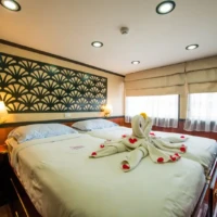 Conveniences: All cabins are exterior-facing and equipped with two low beds that can be joigned together, large storage space, private bathroom with shower, air-conditioning, safe, hairdryer, dresser. Toiletries are available for your use. Onboard Wi-Fi. One cabin on the main deck has an extra bed for a third person (child up to 16).