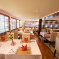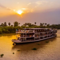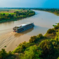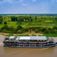 The RV Lan Diep, a 22 cabin river ship, elegantly crosses the Mekong river. Inspired by the Mekong’s ancient tradition of riverboat building, it perfectly blends into the green and authentic scenery along the river. Its hull, covered with exotic wood of ancient style, gives it a refined look.