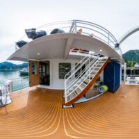 Onboard Features: Full-beam swim step; underwater bow-mounted camera; kayaks, paddleboards, inflatable skiffs, hiking poles; on-deck hot tub; fitness equipment; DVD and book library.