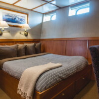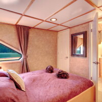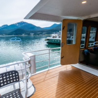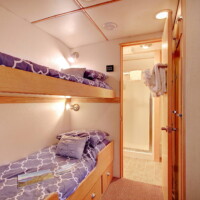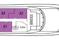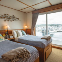 Four decks provide private nooks and shared lounge space on this cozy yacht. The Observation Deck has an on-deck hot tub and fitness equipment; the Bridge Deck houses the much-coveted Admiral cabins, the small library, and our open bridge; the Main Deck features the dining room, bar, and lounge, along with the Pathfinder and Single cabins that work well for guests who don’t manage stairs well. The Cabin Deck below holds the Navigator cabins.